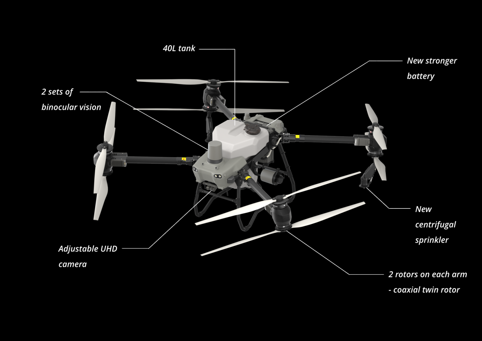 - Radar & RTK: Obstacle avoidance, terrain following, centimetre-level precision